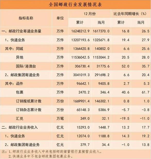 國家郵政局官方微信22日公布2023年郵政行業運行情況,2023年,郵政行業寄遞業務量累計完成1624.8億件,同比增長16.8%。其中,快遞業務量(不包含郵政集團包裹業務)累計完成1320.7億件,同比增長19.4%。
